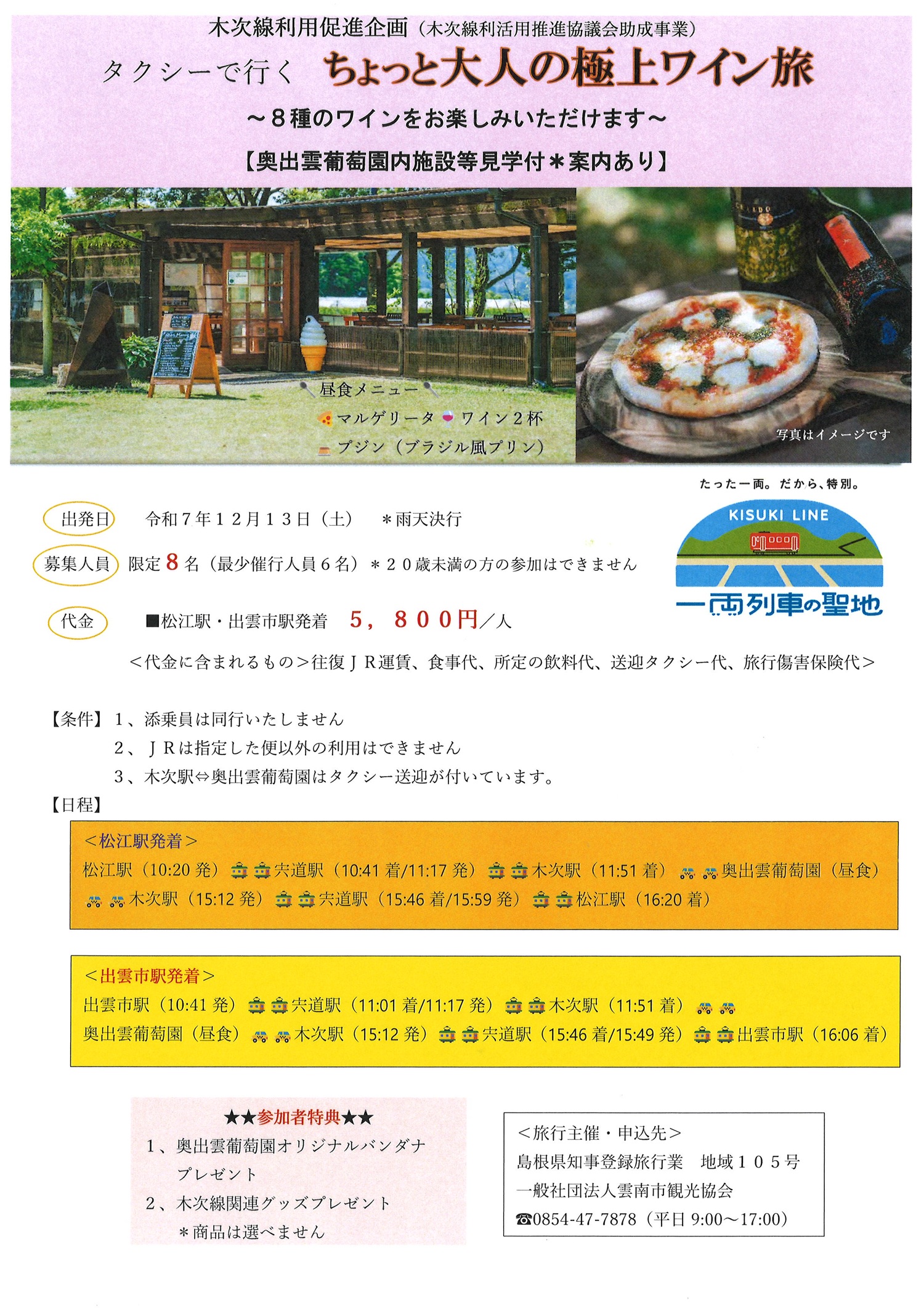満員御礼!【日帰りツアー】タクシーで行く ちょっと大人の極上ワイン旅(2025.12.13)~木次線利用促進企画~