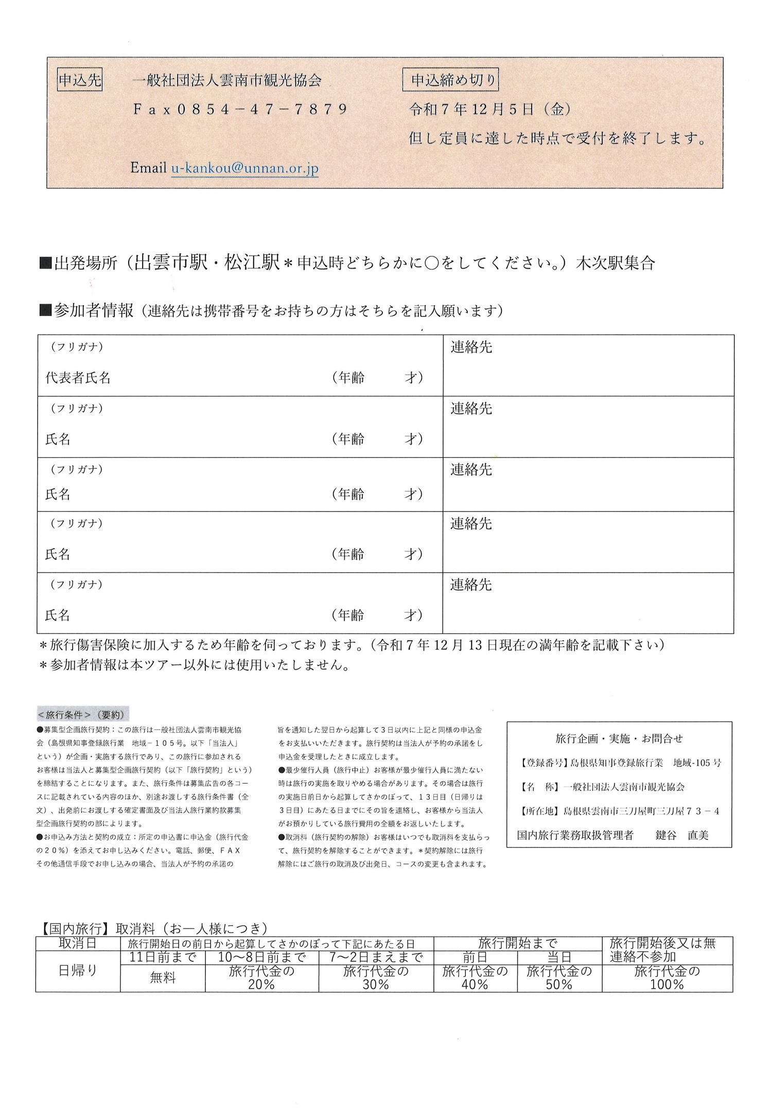 | お問い合わせ・お申し込み先 | 一般社団法人雲南市観光協会(島根県知事登録旅行業 地域105号) 電話:0854-47-7878(平日9:00~17:00) |