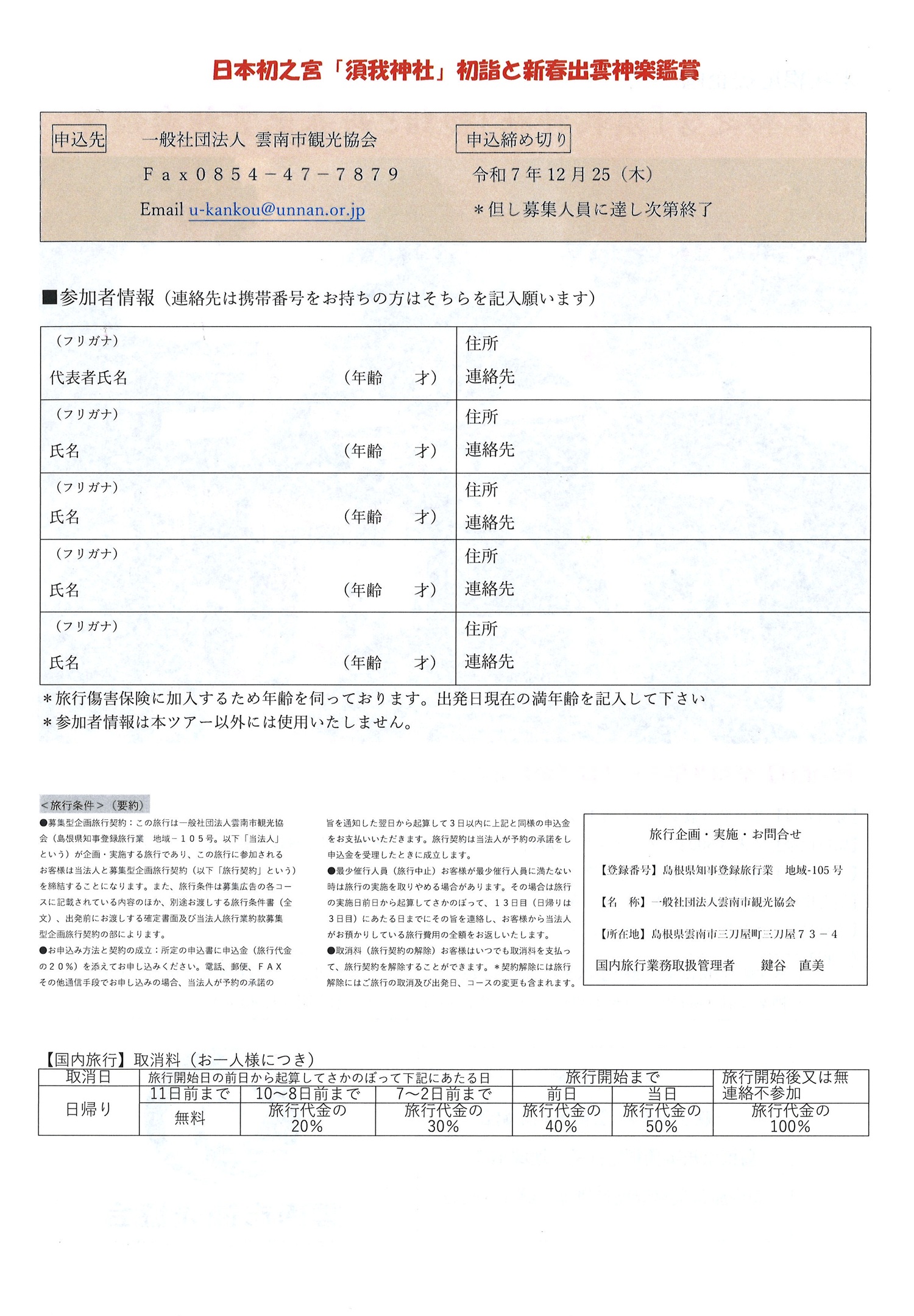 | 行程 | JR木次駅(10:13発)→JR加茂中駅(10:32着)→日本初之宮「須我神社」初詣→神楽の宿にて新春出雲神楽鑑賞→曽田屋(昼食)→JR木次駅(13:40頃着) |