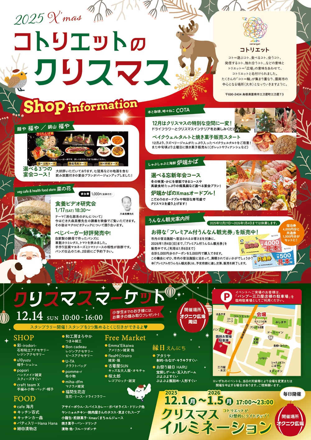 三刀屋木次IC近くにあるコトリエットでは、恒例のクリスマスマーケットが開催されます。