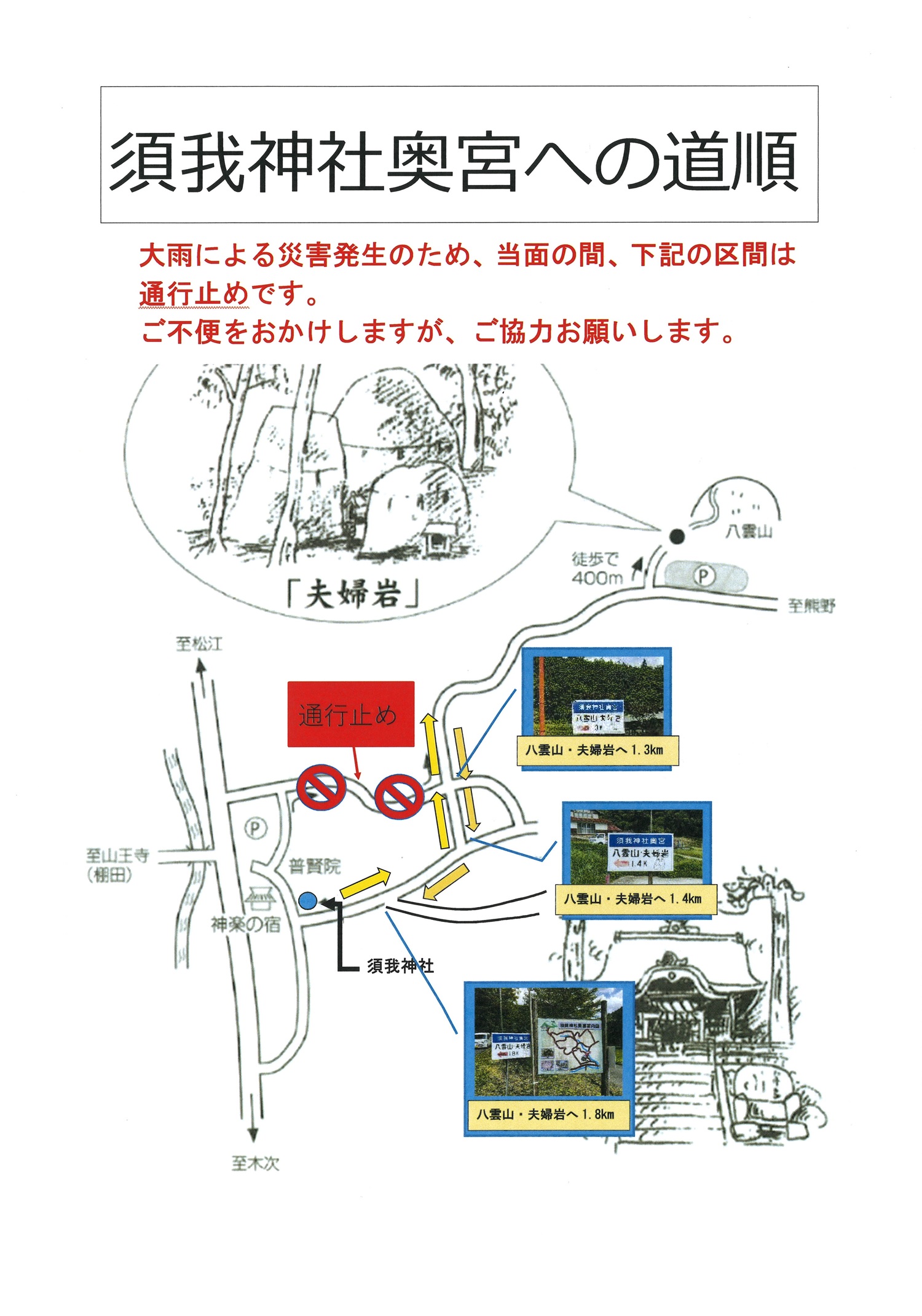 【須我神社 奥宮】通行止めにともなう う回路のご案内(2025.9.25) 大雨による災害発生のため、当面のあいだ、須我神社奥宮へ向かう道路が通行止めとなっています。 ご不便をおかけしますが、下記にご案内の道路をご利用いただき、奥宮へお越しいただきますよう、お願いいたします。