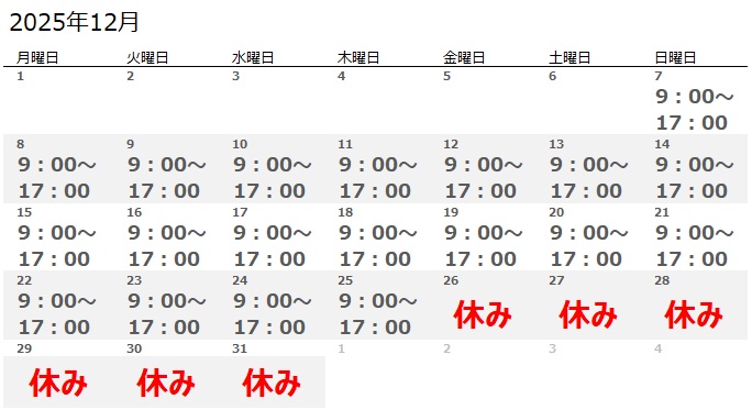 12月26日から2026年1月4日(日)までは休業し、2026年は、1月5日の朝9:00より営業いたします。