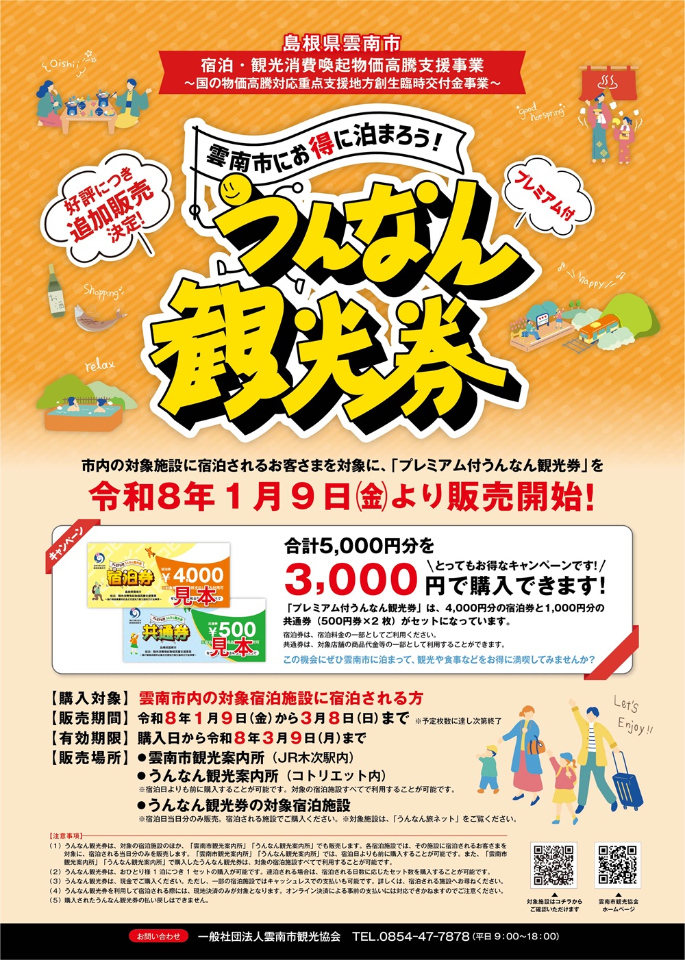 このたび雲南市では、国の「物価高騰対応重点支援地方創生臨時交付金」を活用し、令和8年1月9日(金)より、「プレミアム付きうんなん観光券」を枚数限定で追加販売することにしました。