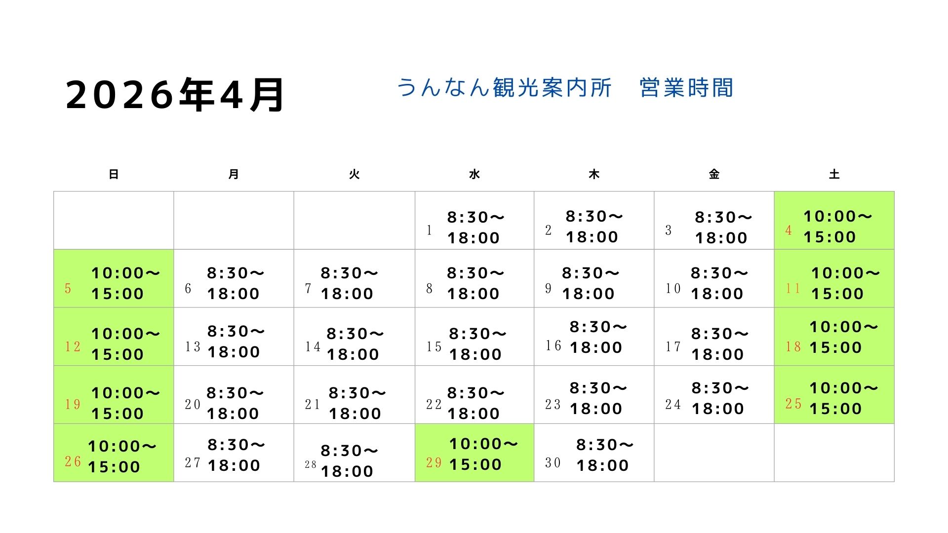 【2026年4月 うんなん観光案内所 営業時間】