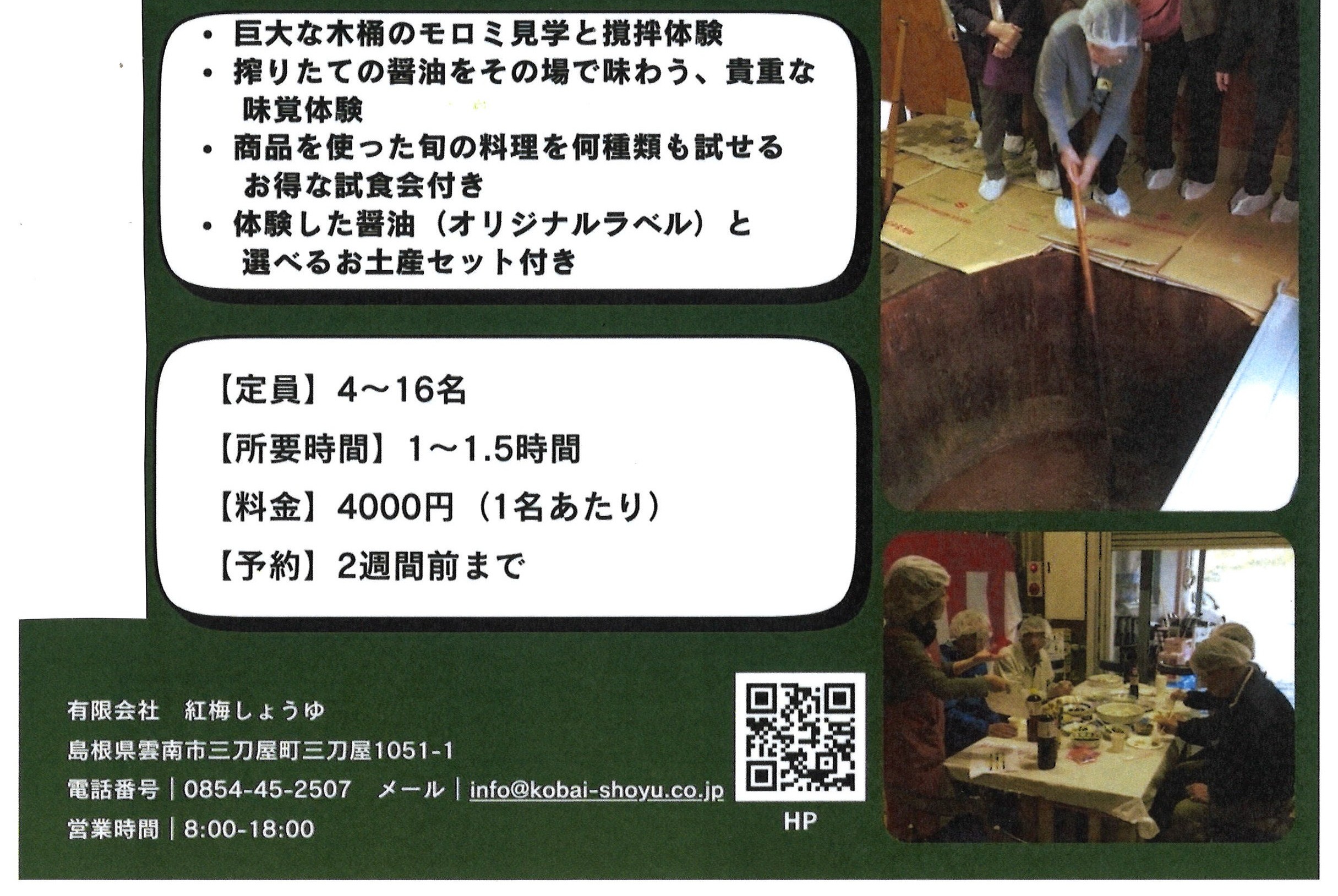 ご案内 紅梅しょうゆは、創業190年を誇る伝統を持つ醤油ブランドです。 島根の豊かな自然の中、職人たちが手作業で丁寧に醤油を作り出しています。 島根の老舗「紅梅しょうゆ」で蔵体験ツアーに参加し、 ここでしか味わえない醤油の奥深さにに出会ってみませんか?